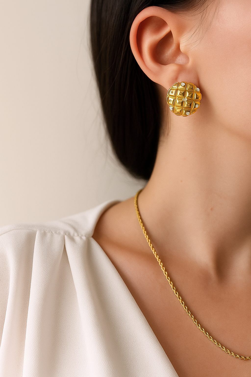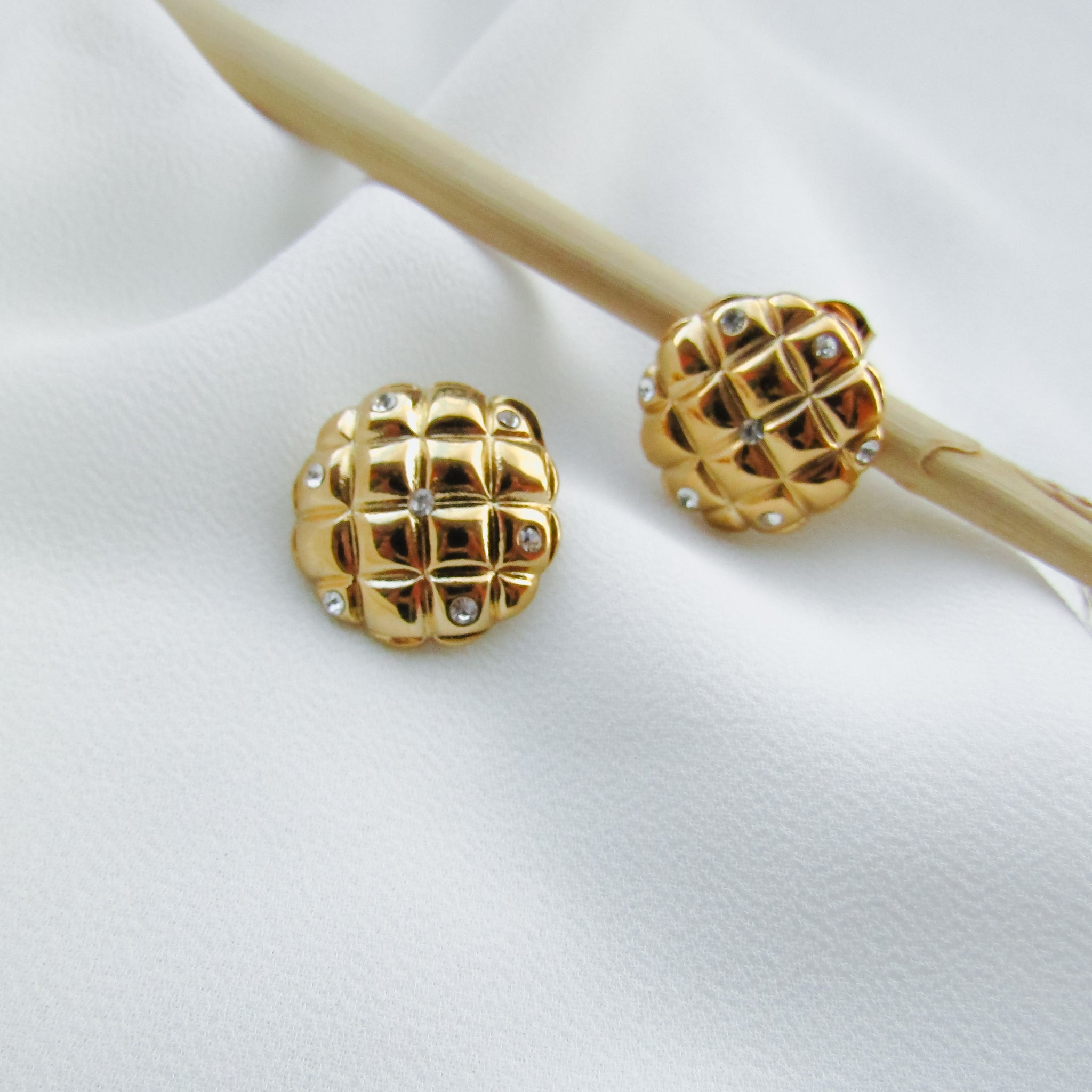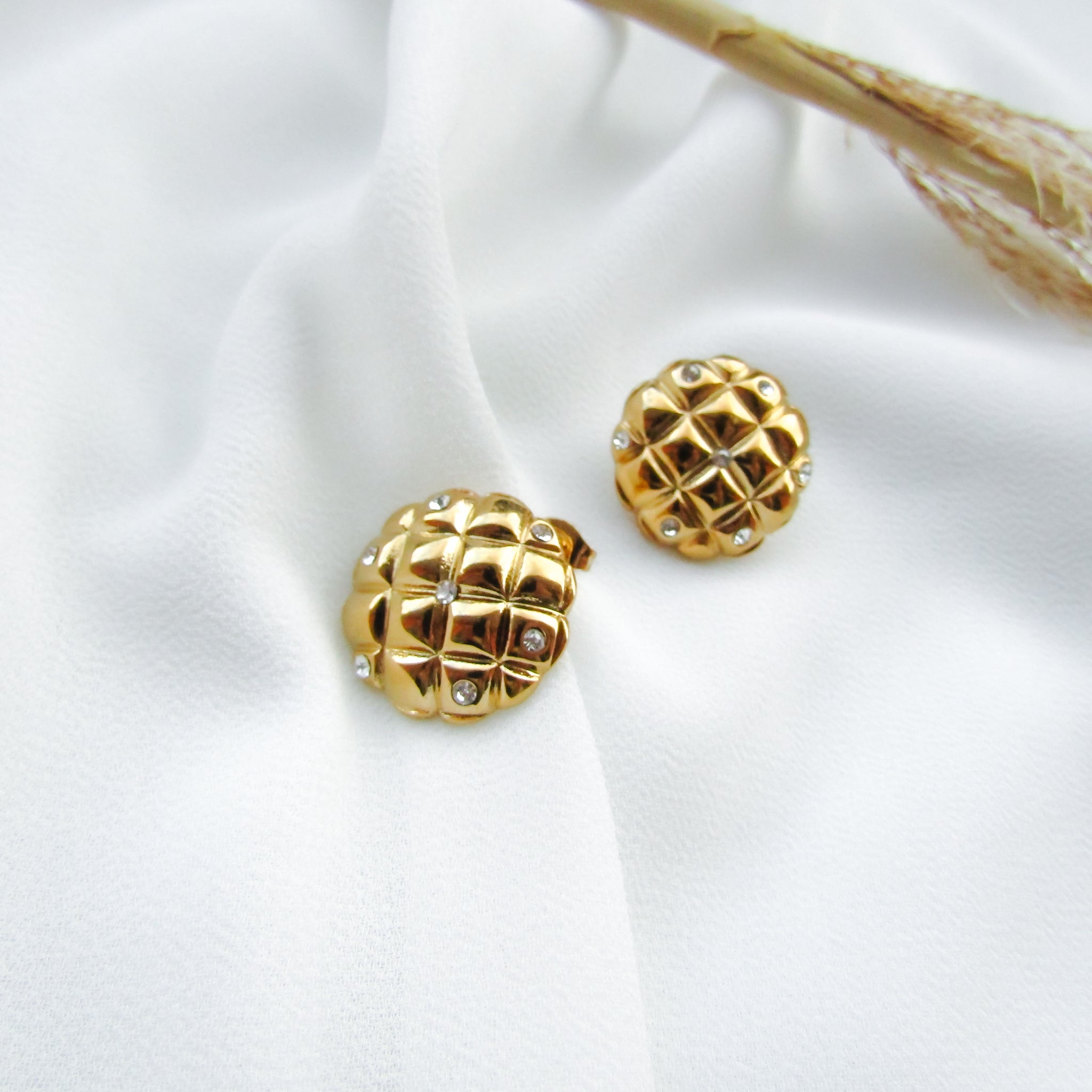 Orecchini a bottoncino con strass a trama rigata in acciaio inossidabile 316 L. Chiusura a farfallina in acciaio.