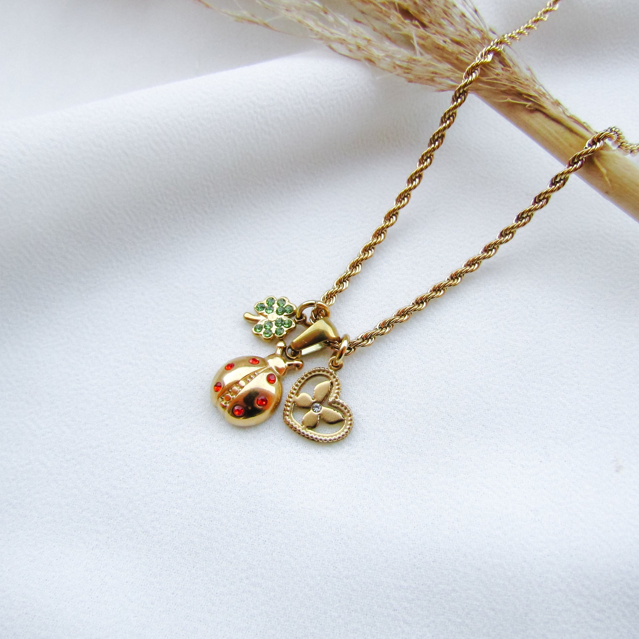 Collana maglia intrecciata di spessore di 2 mm in acciaio inossidabile 304L placcato oro. Pendente Coccinella in acciaio inossidabile con piccoli strass zirconi arancioni di 1,5 x 1 cm; pendente quadrifoglio mini di quasi 1 cm con strass zirconcini verdi e infine ciondolo a forma di cuore di farfalla con strass di 1 cm sempre in acciaio inossidabile.