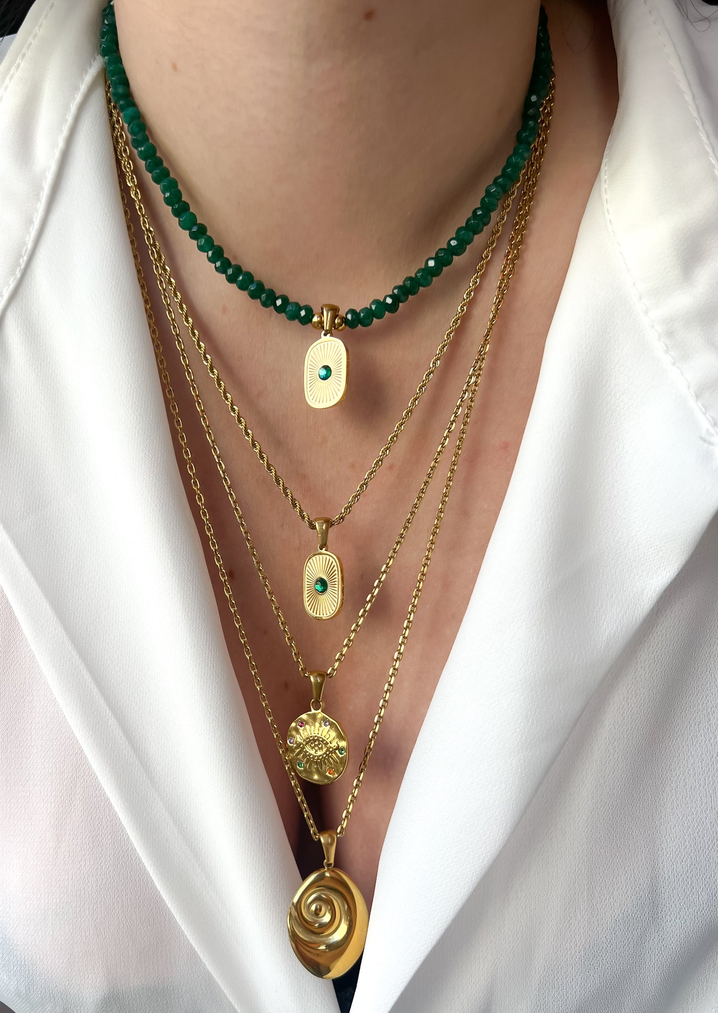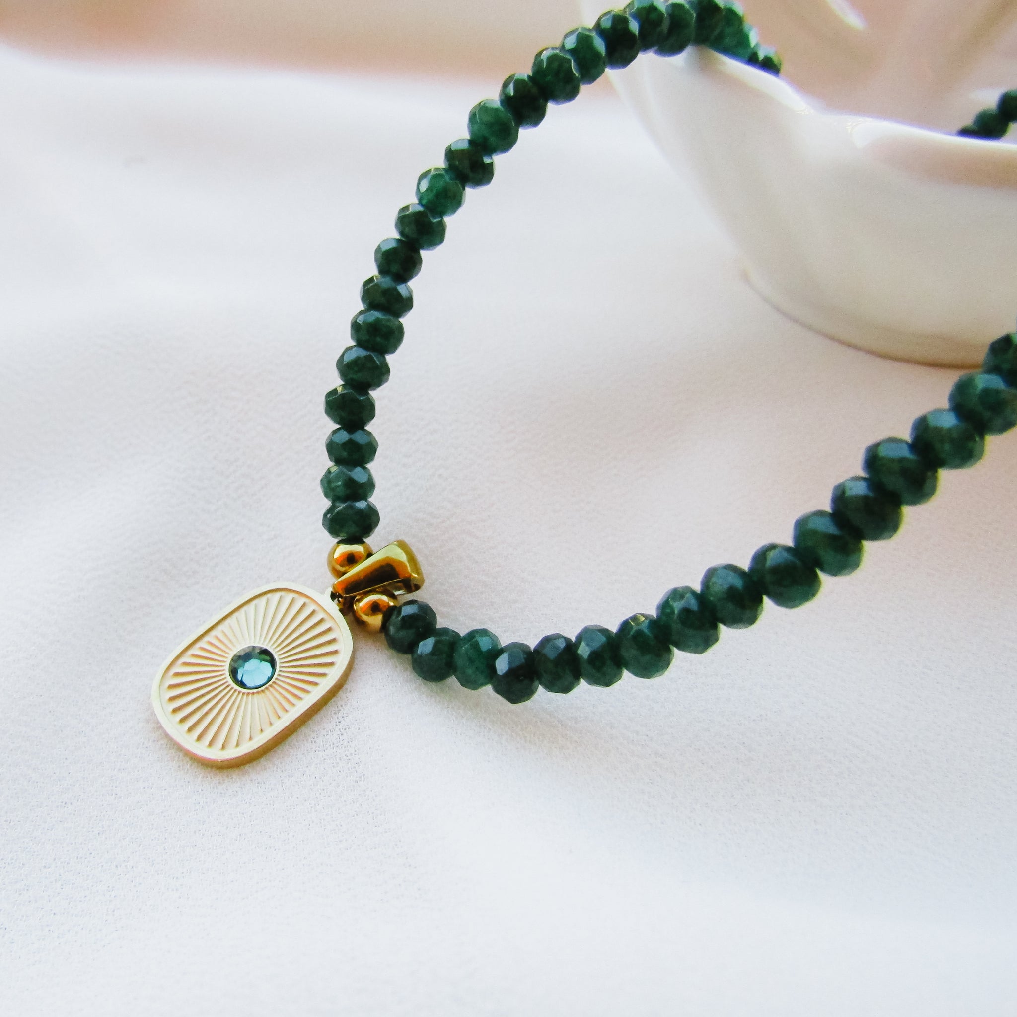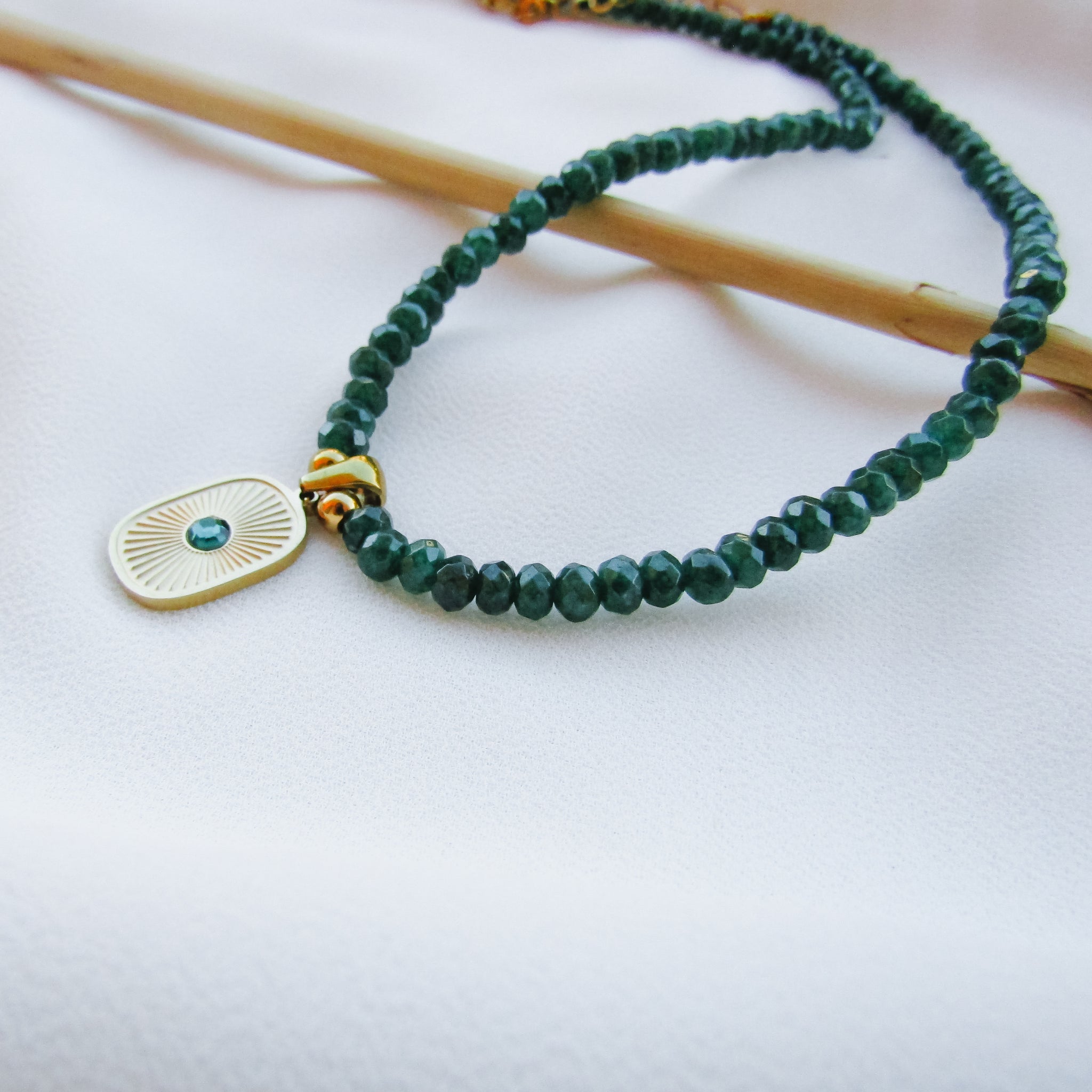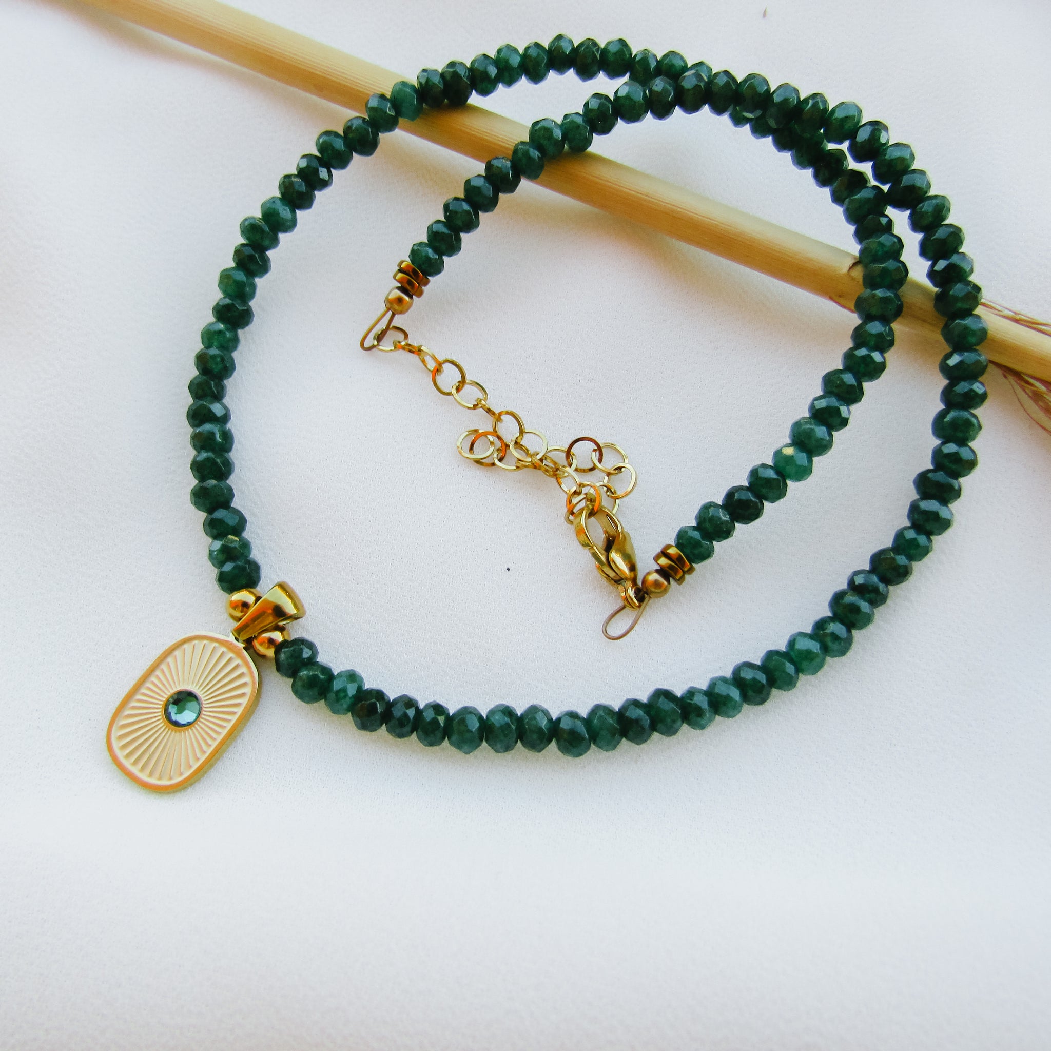 Girocollo in pietre dure in agata rondella 4 x 3 mm di colore Verde pino, con al centro due piccole sfere in acciaio inossidabile e una medaglietta pendente Ovale sempre in acciaio con al centro uno strass verde e delle striature di 1,8 x 1,2 cm.