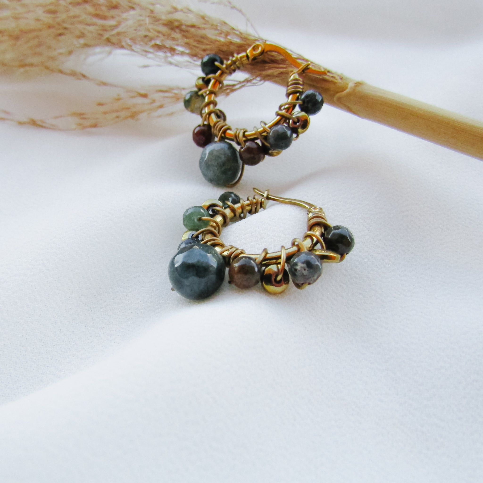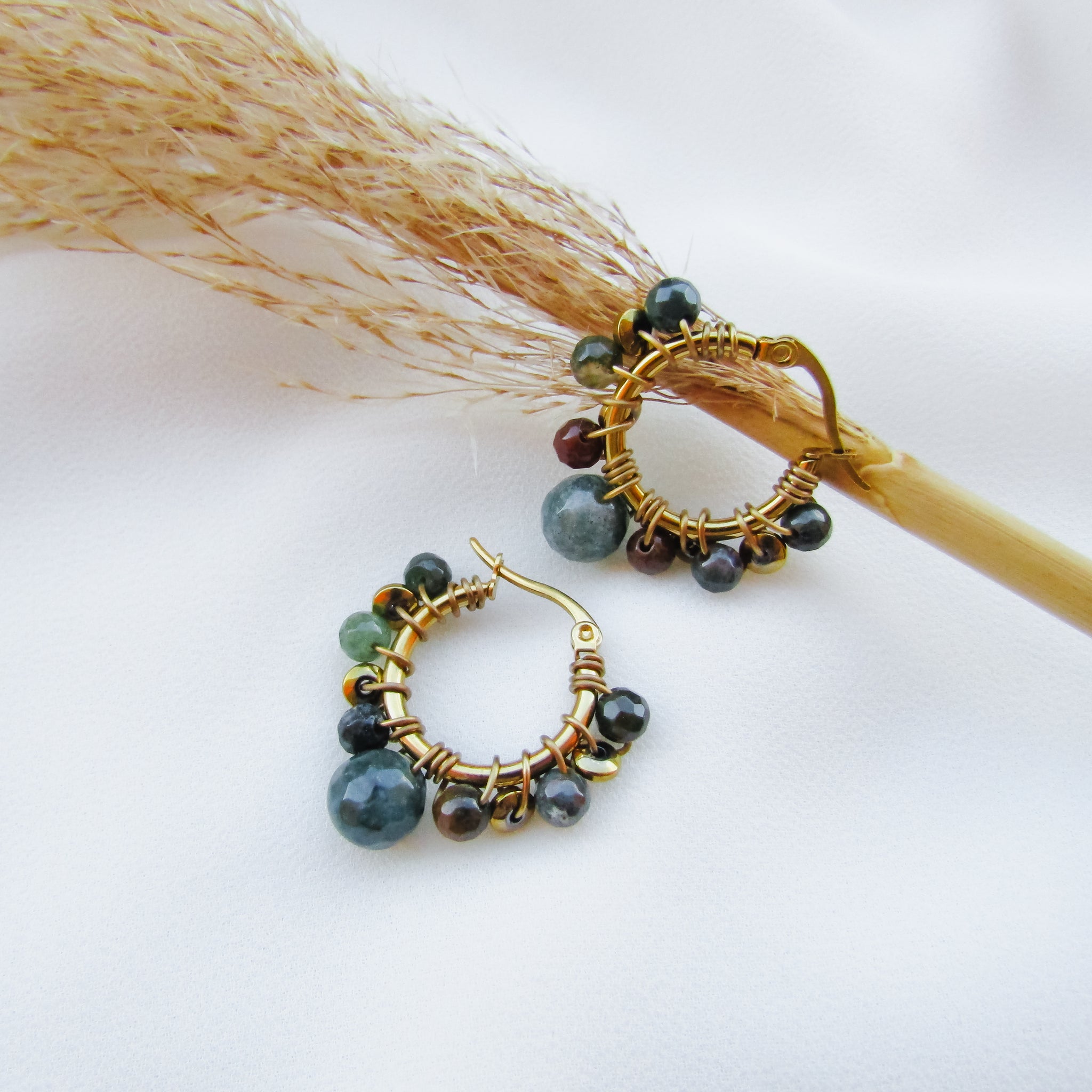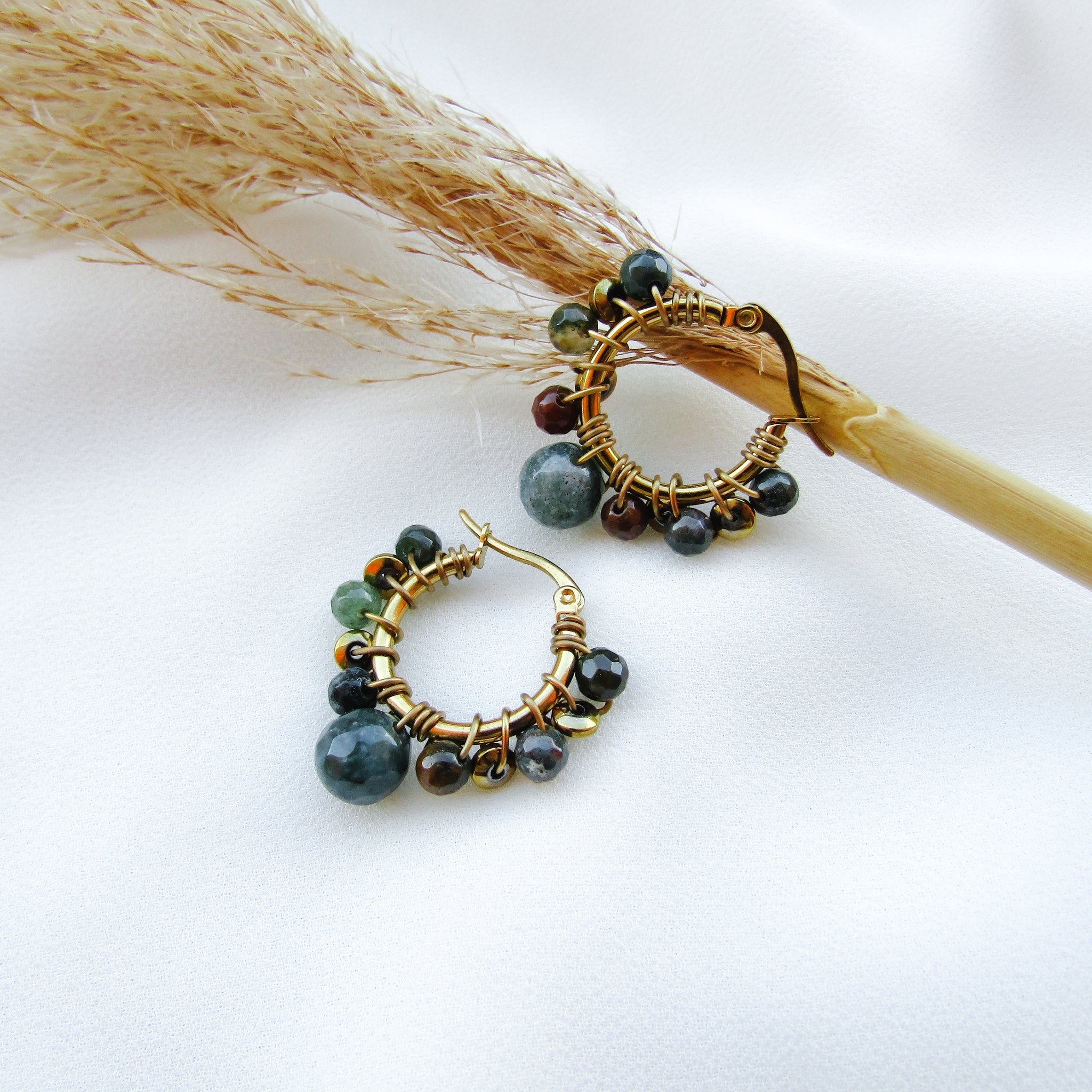 Rivestiti con pietre in agata indiana 4 mm con una pietra centrale da 8 mm ( Tipico di queste pietre è la loro unicità di colore che spazia dal verde scuro al verde chiaro, ai toni del marrone e beige ) ; intervallate da ematite rondella di 4 mm . In variante sia oro che acciaio naturale.