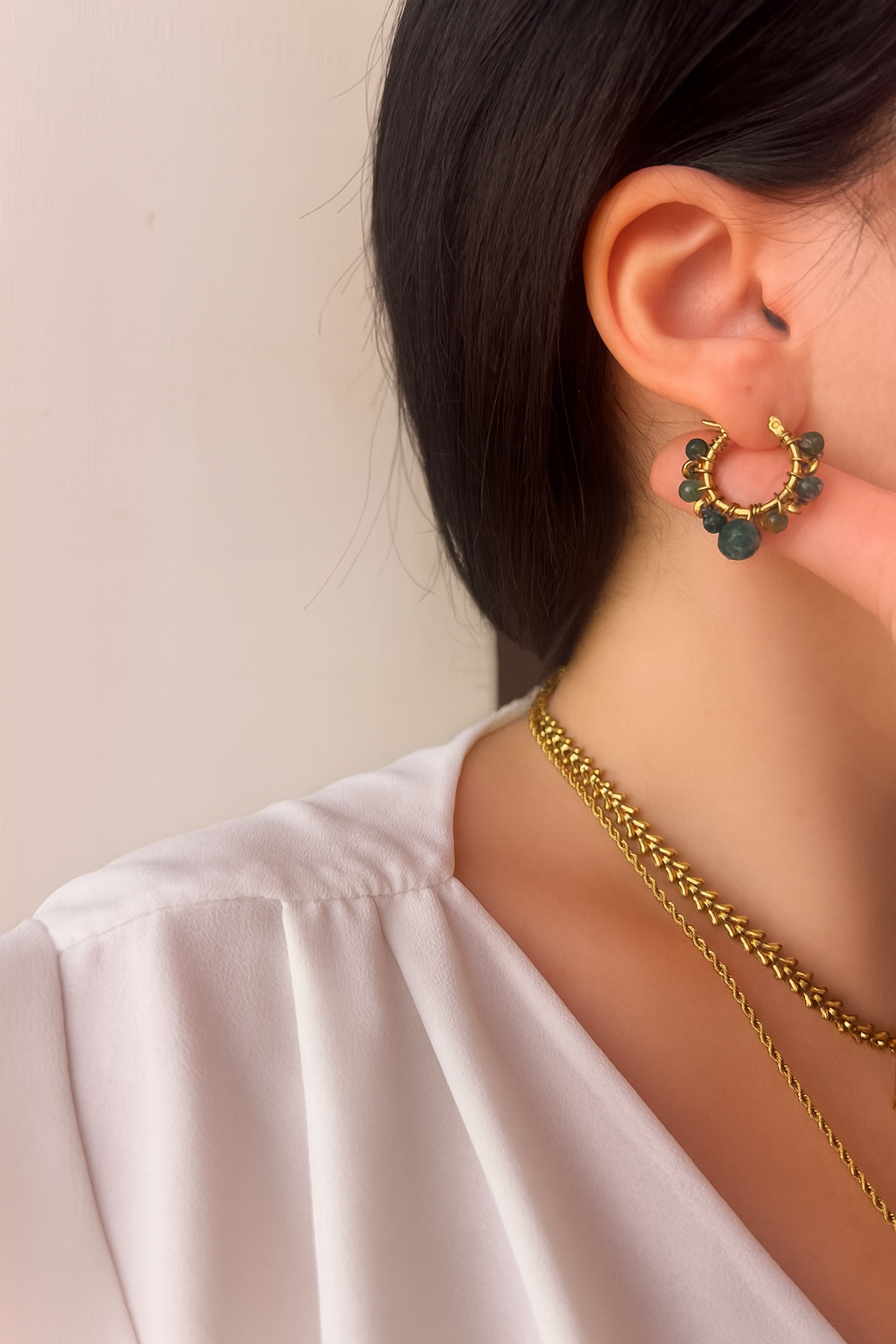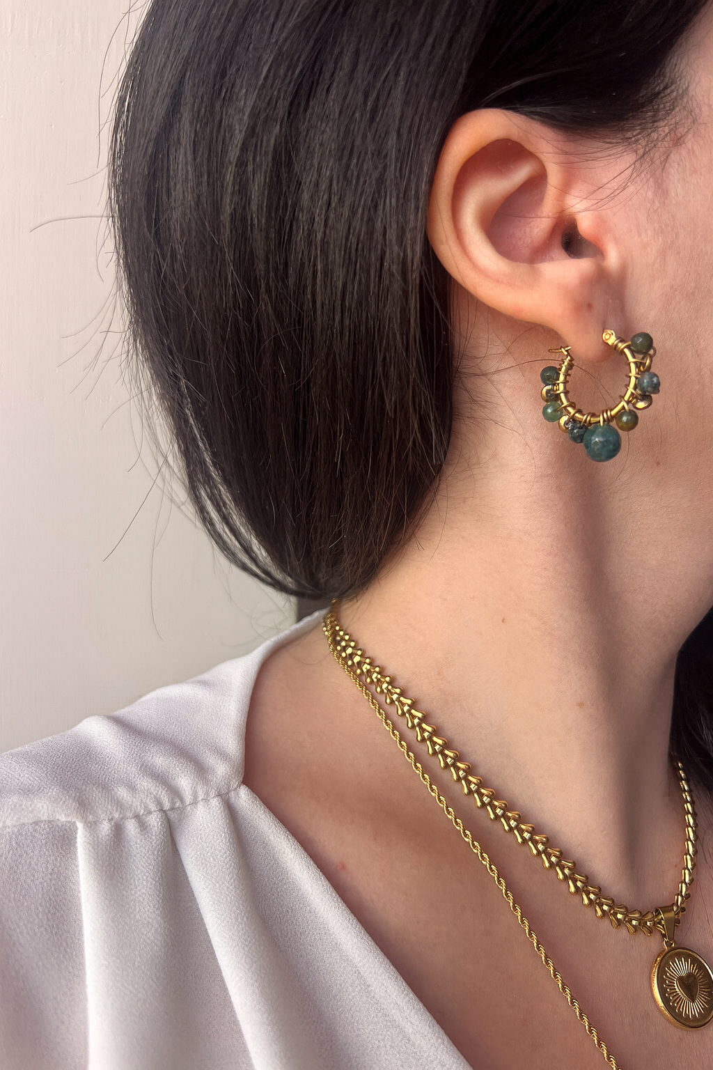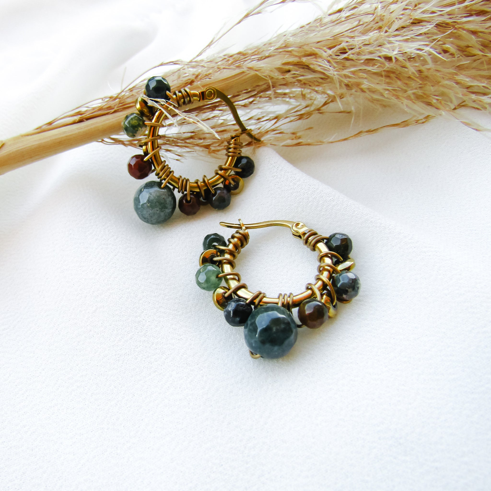 Rivestiti con pietre in agata indiana 4 mm con una pietra centrale da 8 mm ( Tipico di queste pietre è la loro unicità di colore che spazia dal verde scuro al verde chiaro, ai toni del marrone e beige ) ; intervallate da ematite rondella di 4 mm . In variante sia oro che acciaio naturale.