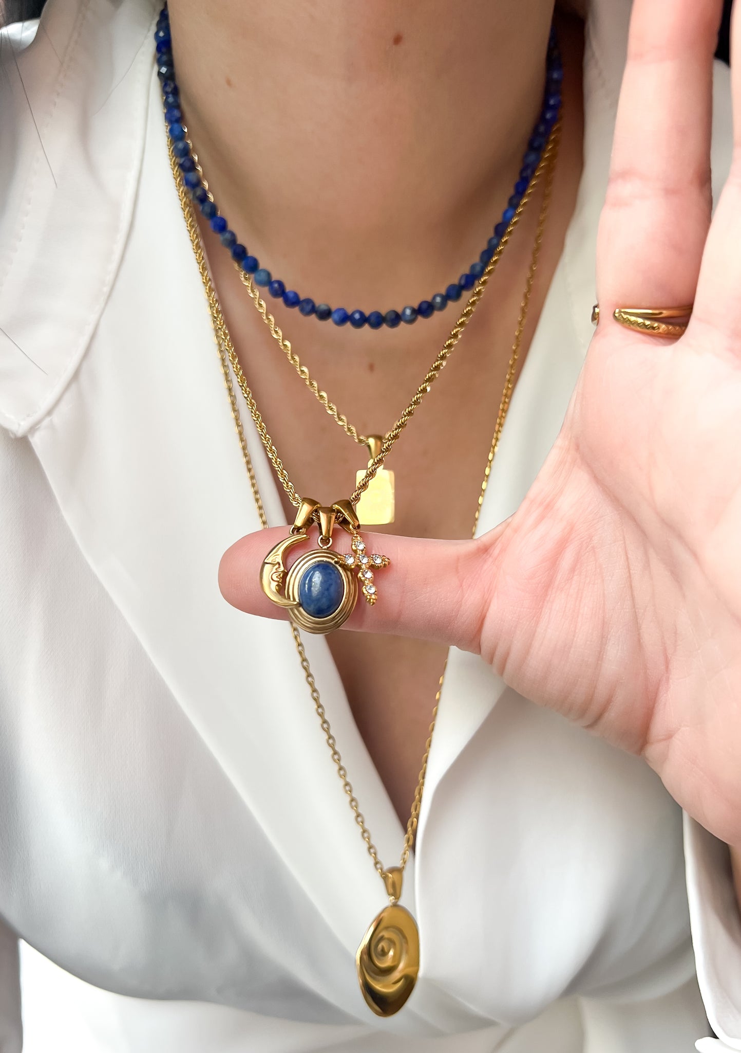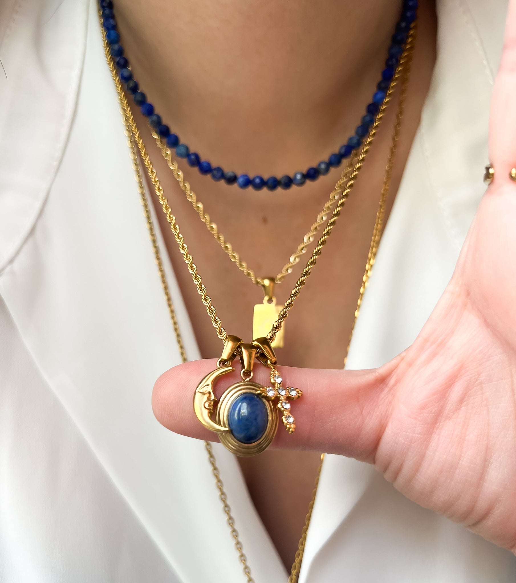 Collana maglia intrecciata di spessore di 2 mm in acciaio inossidabile 304L placcato oro con tre pendenti. Pendente a forma di Luna in rilievo in acciaio 2 cm, pendente a croce in acciaio inossidabile 304L e cristalli e strass incastonati internamente di 1,8 cm e infine Ciondolo in acciaio con pietra di giada blu ovale di 1,9 cm x 1,4 cm.