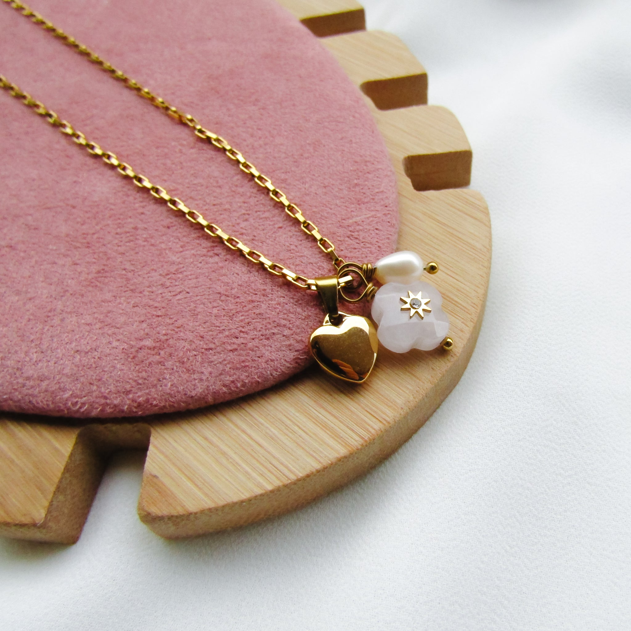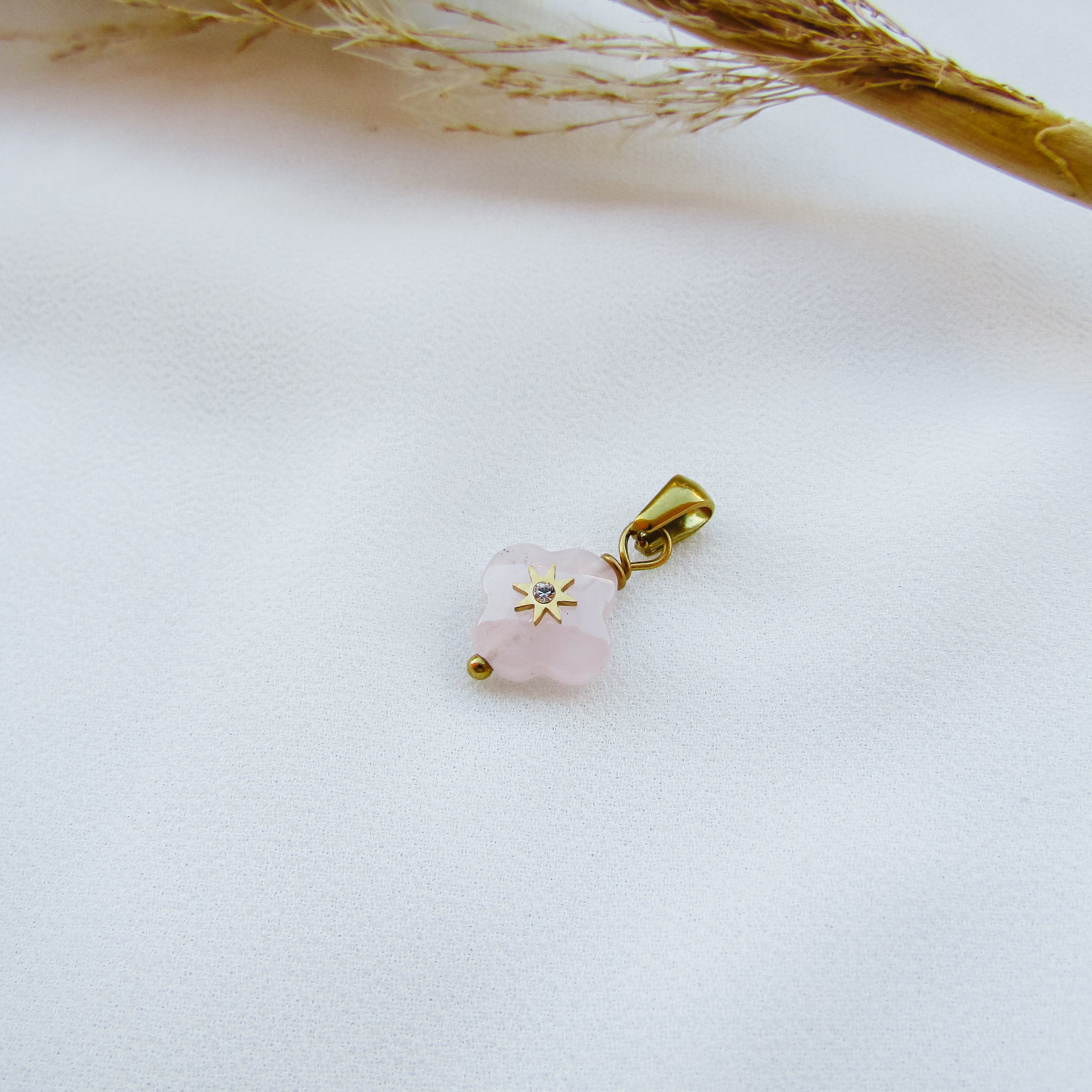 Pendente pietra a forma di quadrifoglio in quarzo rosa di 1,3 cm con al centro una stellina di 5 mm in acciaio con un piccolissimo zirconcino con gancio in acciaio.