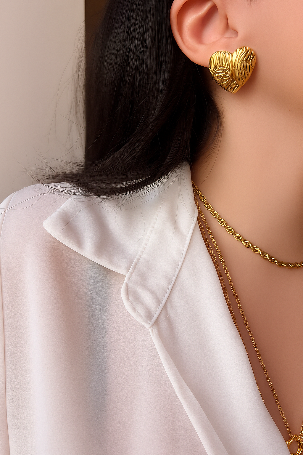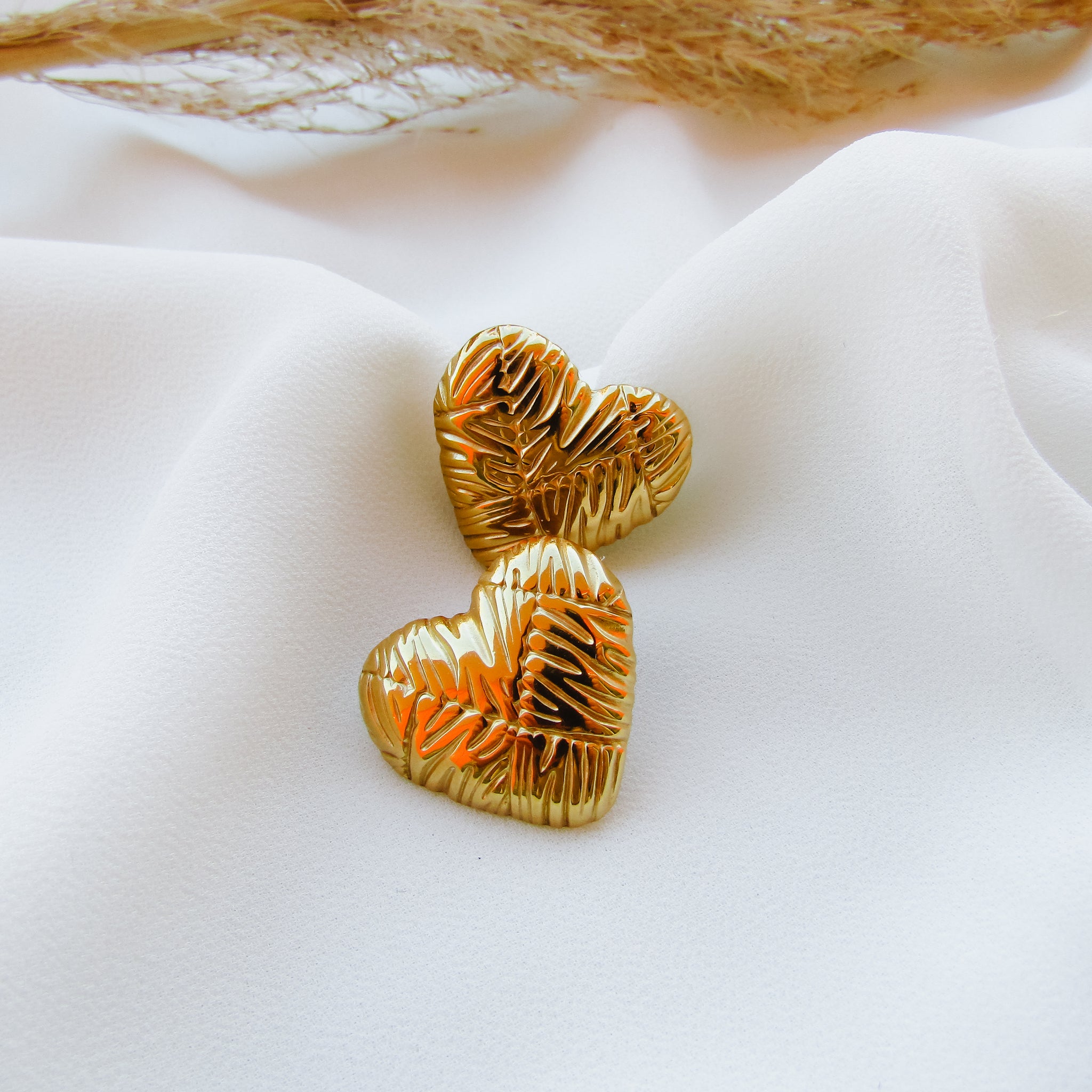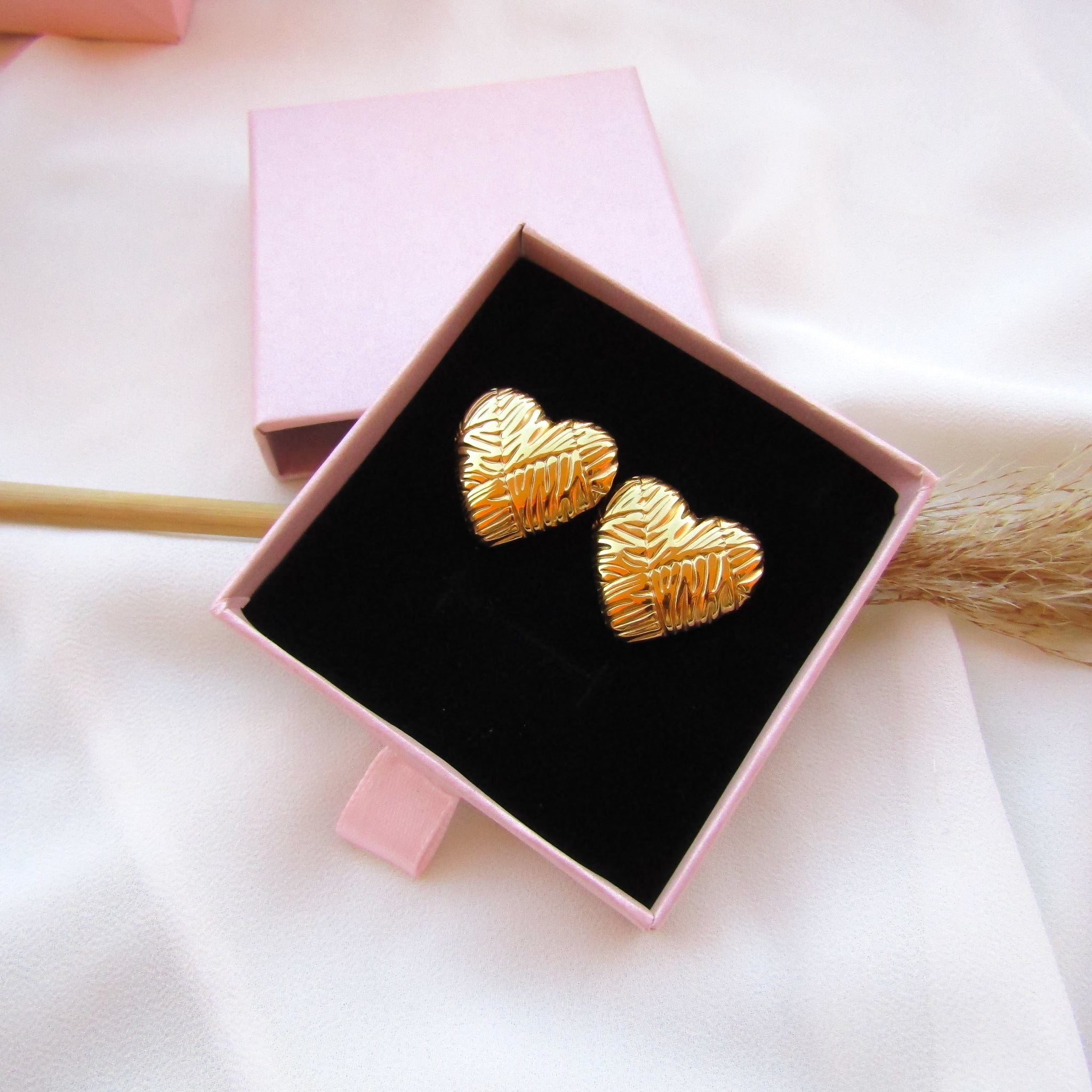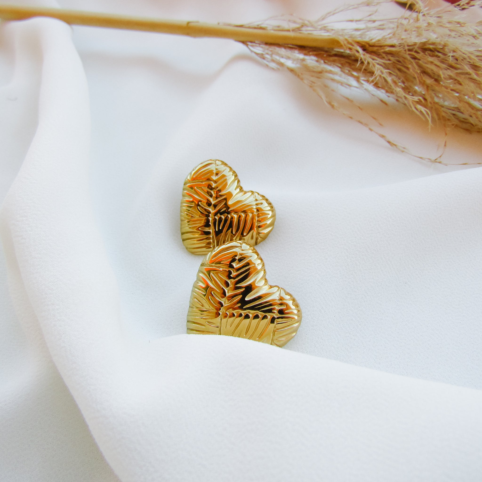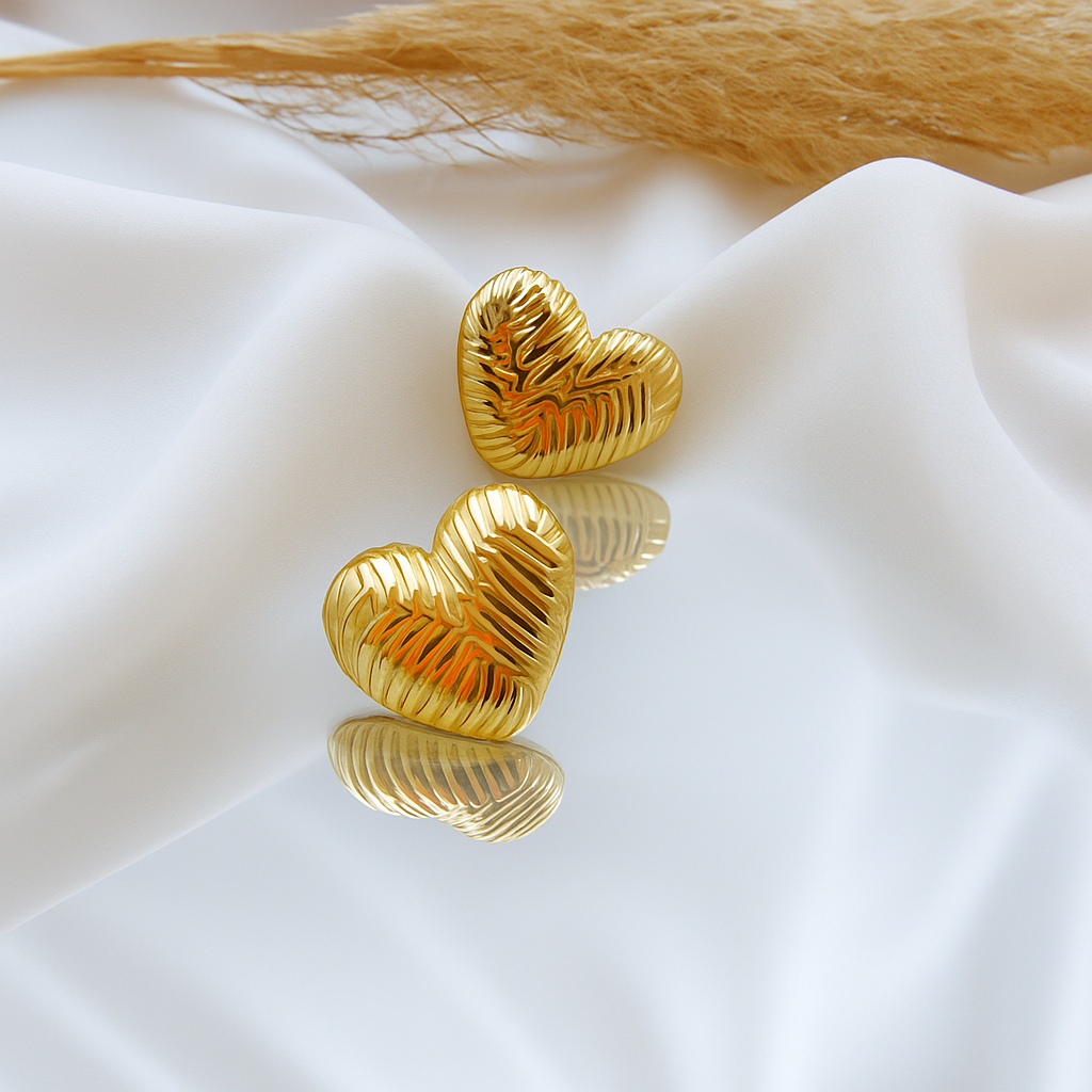 Orecchini a perno in Acciaio Inossidabile 304L a forma di cuore bombato con striature ed effetto geometrico sulla superficie. Leggeri e versatili.