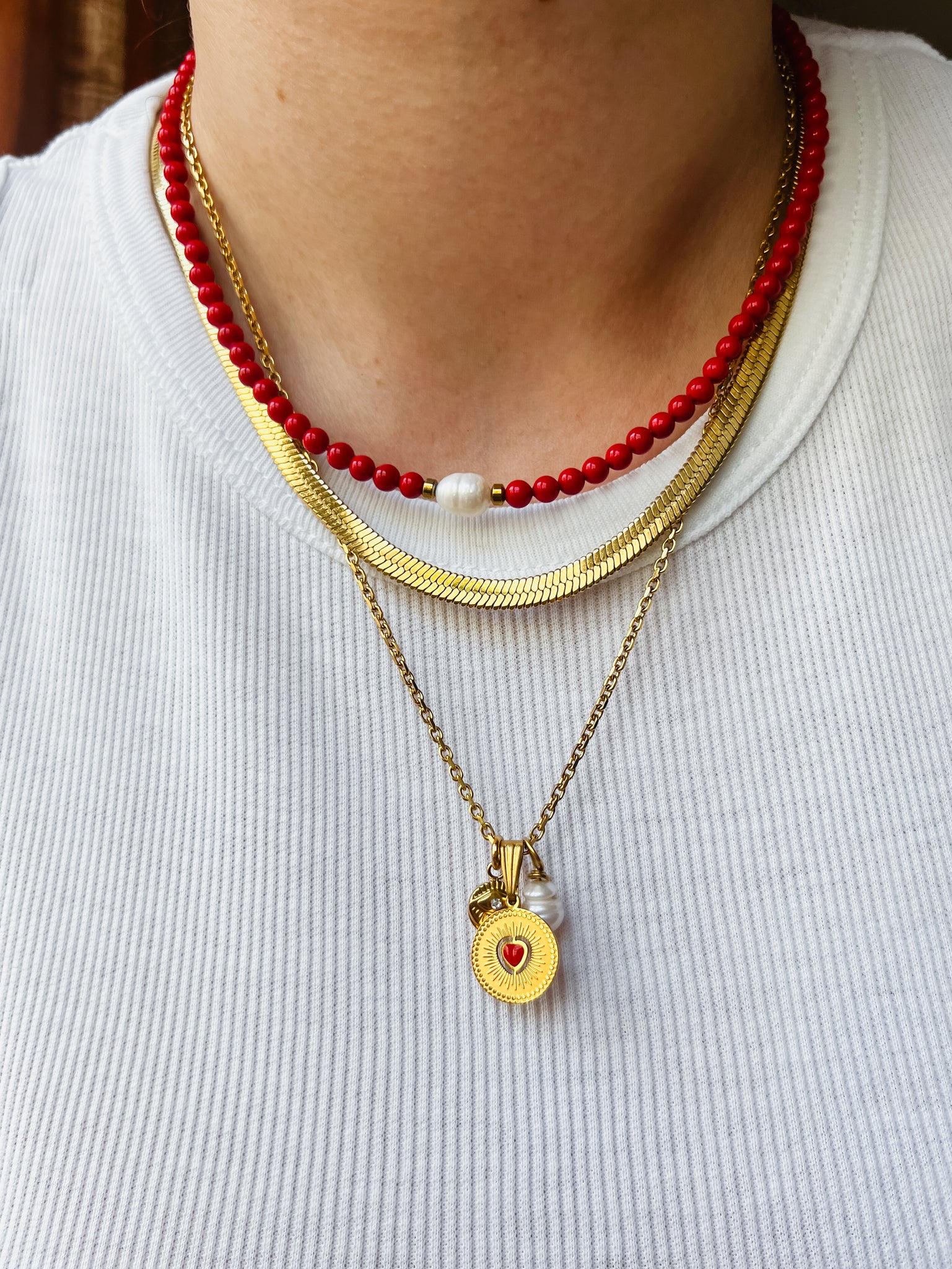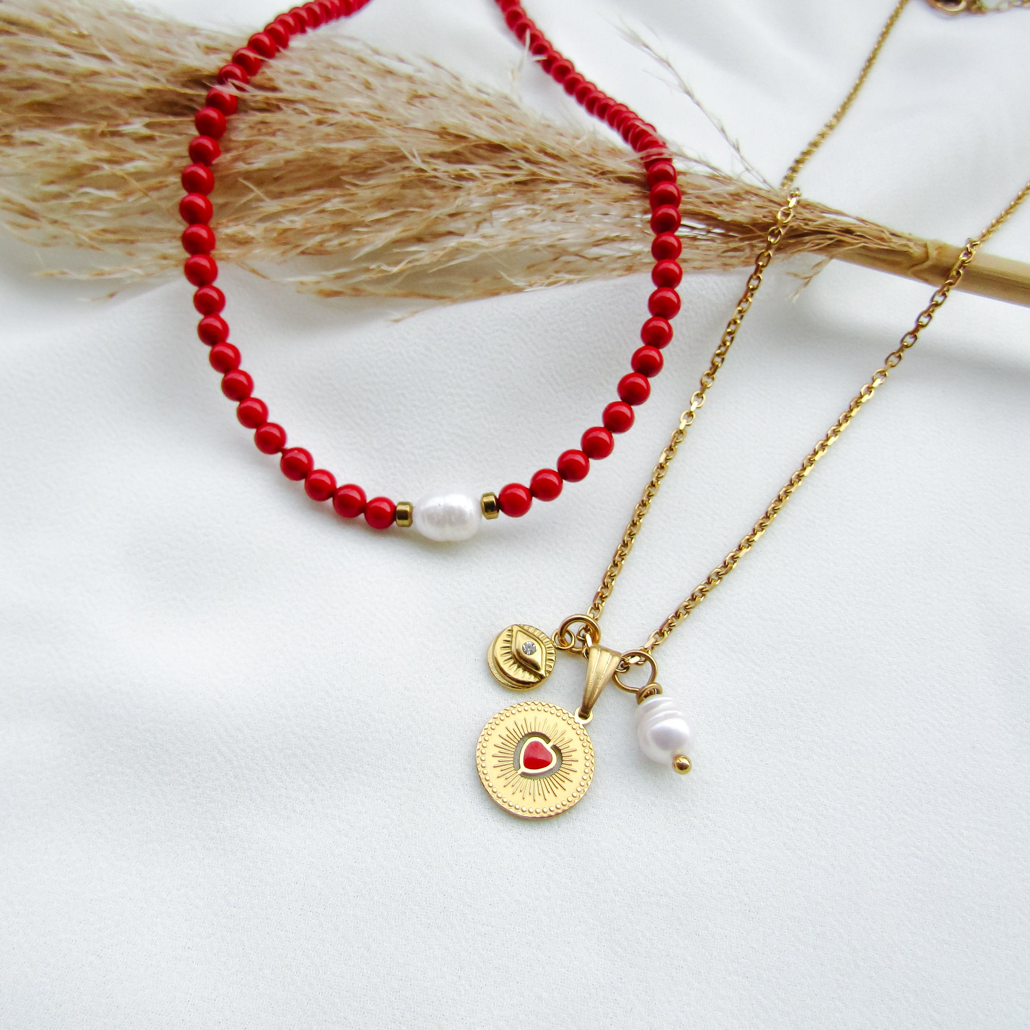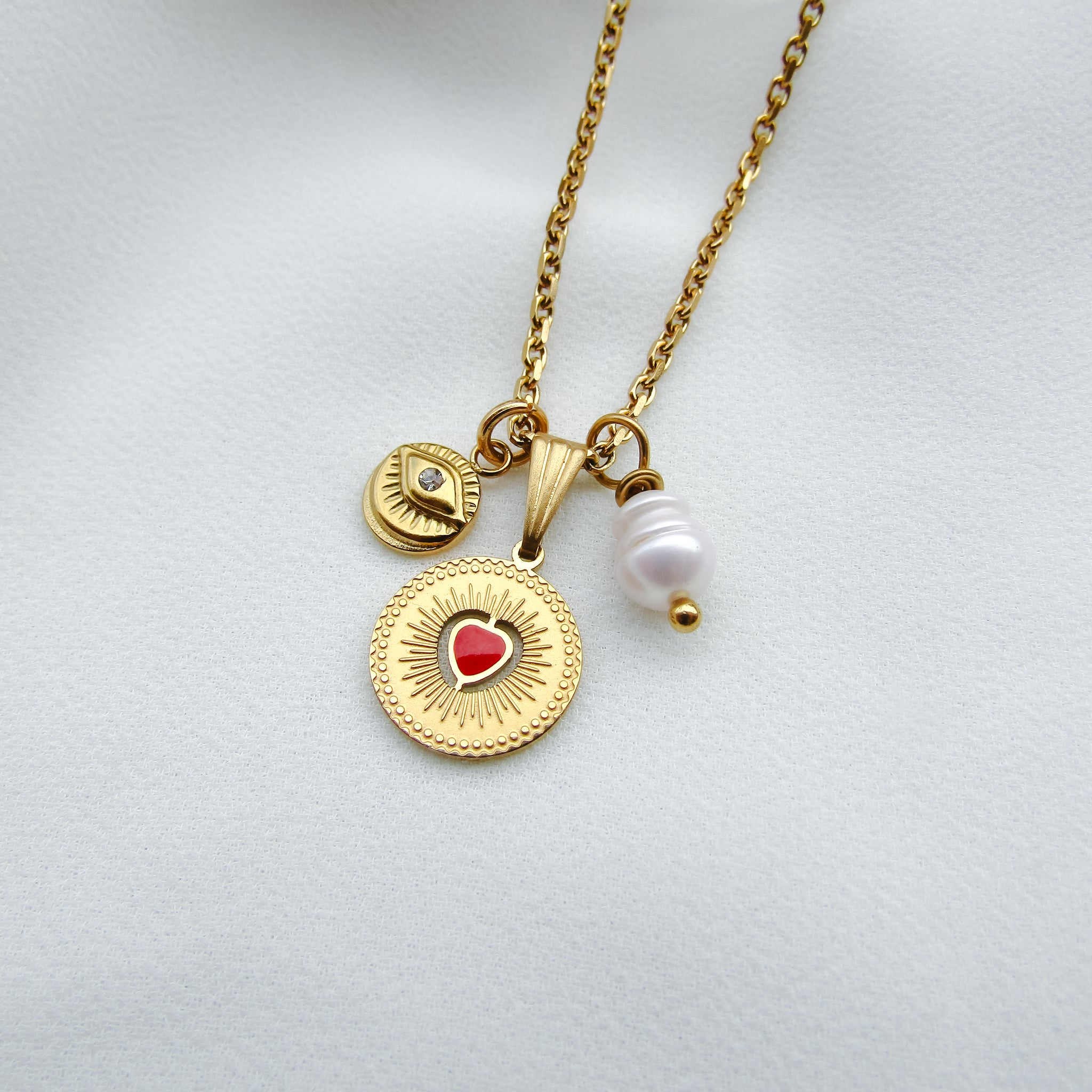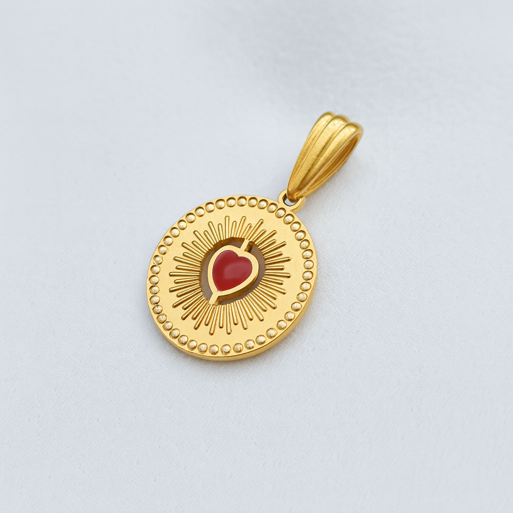 Pendente rotondo da 1,3 cm in acciaio inossidabile con al centro cuore rosso in resina epossidica.